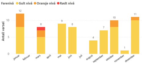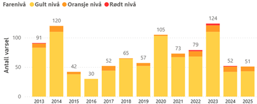 I løpet av året sendte NVE ut 70 flomvarsler (60 gule, 9 oransje og 1 rødt) og 51 jordskredvarsler (43 gule og 8 oransje). Dette er litt under gjennomsnittet for perioden 2013–2025.