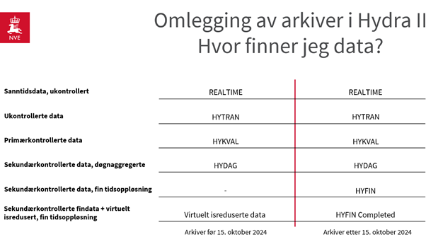 Brukere av hydrologiske målinger etterspør i økende grad kvalitetskontrollerte data med høy tidsoppløsning. For å imøtekomme dette behovet vil hydrologisk avdeling i løpet av oktober legge om arkivene i NVEs hydrologiske database Hydra II.